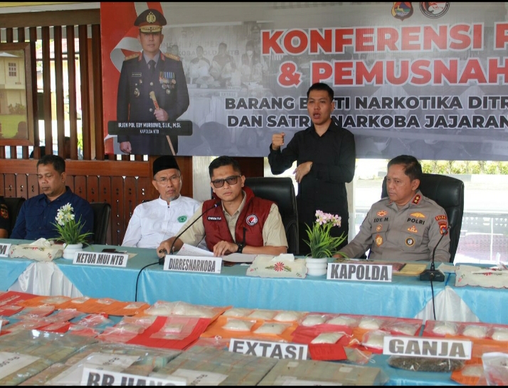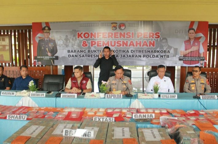 Mataram | Fokuslensanusantara.com | 26/02/2026 -Polda NTB menggelar konferensi pers sekaligus pemusnahan barang bukti narkotika, hasil pengungkapan Ditresnarkoba dan Satresnarkoba jajaran. Kegiatan berlangsung di Tribun Bhara Daksa Polda NTB, Kamis (26/2/2026), dipimpin langsung Kapolda NTB Irjen Pol. Edy Murbowo, S.I.K., M.Si..