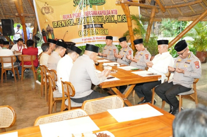 Mataram NTB | Fokuslensanusantara.com | Kapolda NTB Irjen Pol. Edy Murbowo, S.I.K., M.Si., Kamis (7/3/2026) malam, menghadiri buka puasa bersama organisasi kepemudaan NTB dan Badan Eksekutif Mahasiswa (BEM). Kegiatan berlangsung di Rumah Makan Dapoer Sasak mulai pukul 18.00 Wita hingga 19.20 Wita.