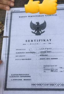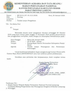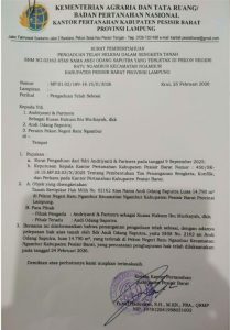 Berdasarkan dokumen dari Kantor Pertanahan Kabupaten Pesisir Barat tertanggal 25 Februari 2026, terdapat informasi sebagai berikut :